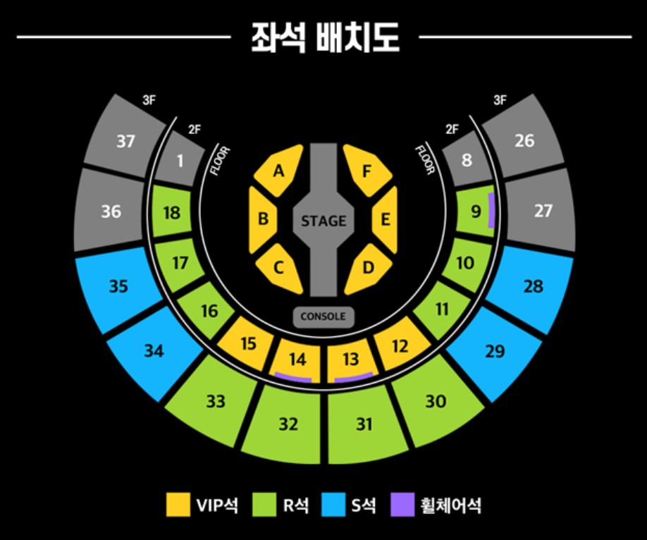 - 좌석 배치도: 색깔별 구역 확인 가능 (무대 중앙 기준 원형 구조)